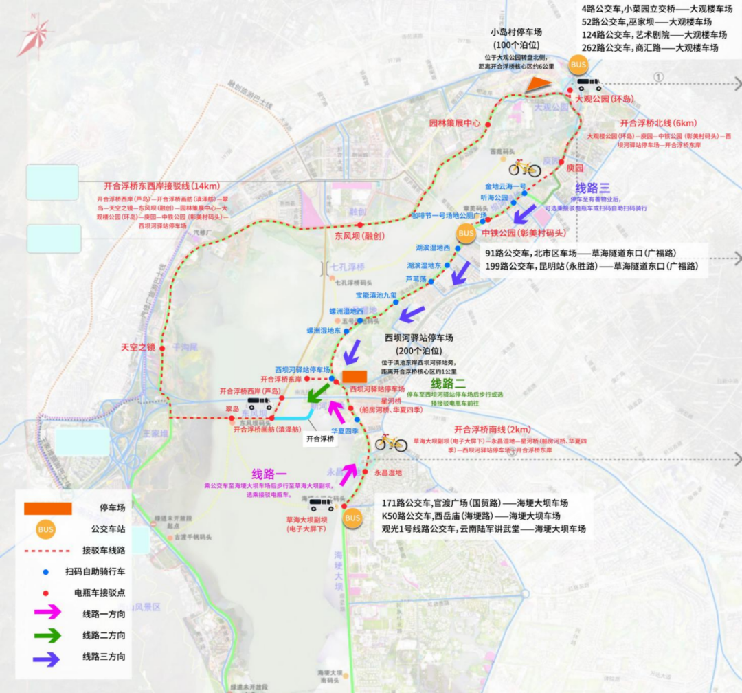 从草海西岸前往的市民与游客,可以把车停到融创文旅城,然后步行至东风坝,从东风坝中段进入开合浮桥。从西山公园附近进入,也可以将车停放在碧鸡博览园附近停车场,步行至东风坝中段,进入开合浮桥。